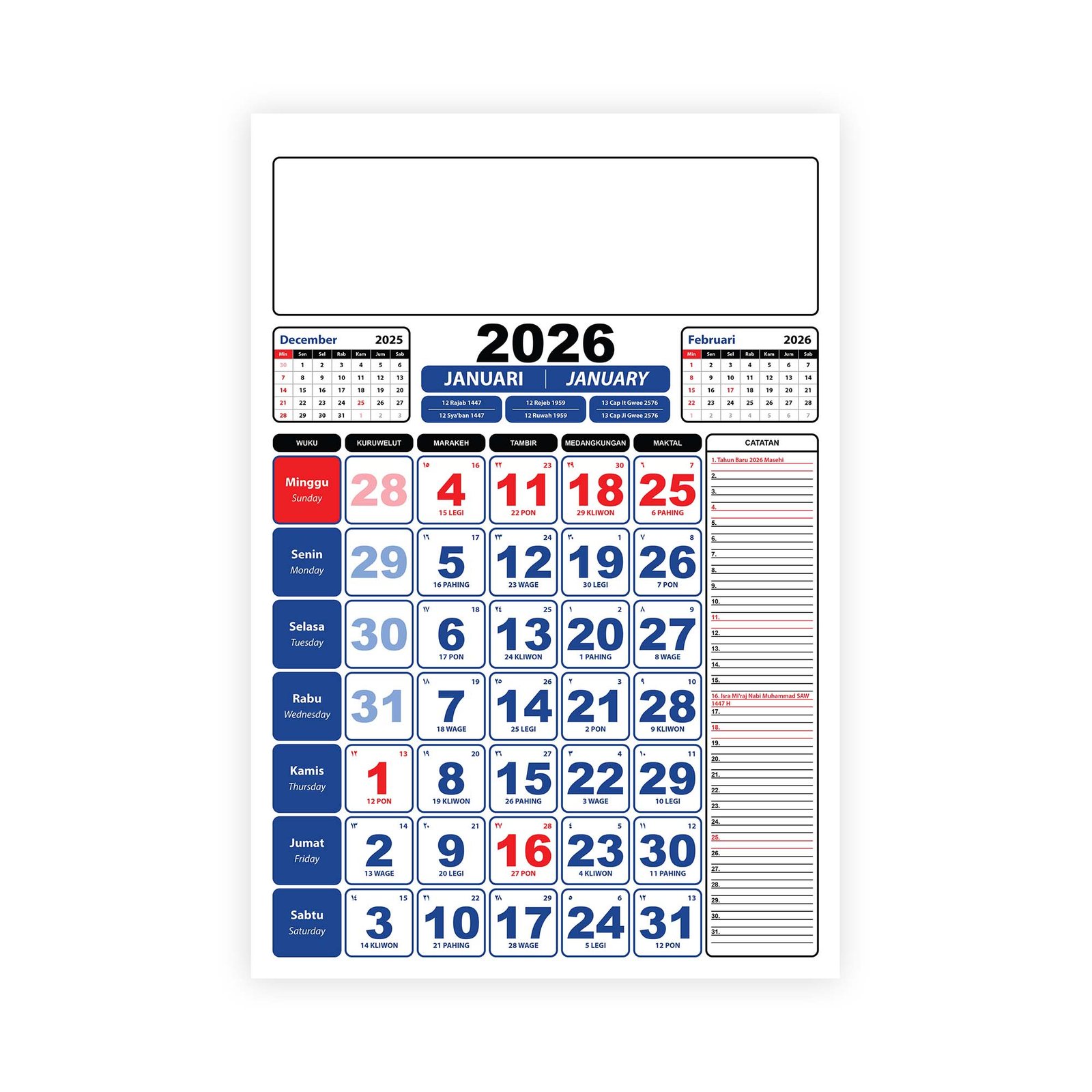 Kalender Dinding yang berisi 12 halaman ukuran A3+ (33×48,5cm) Format penanggalan Hijriyah, Jawa, dan Cina.